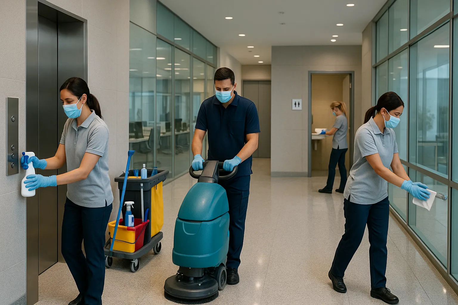 Limpieza de halls, conserjerías, pasillos, gimnasios, quinchos, oficinas, ascensores y escaleras.